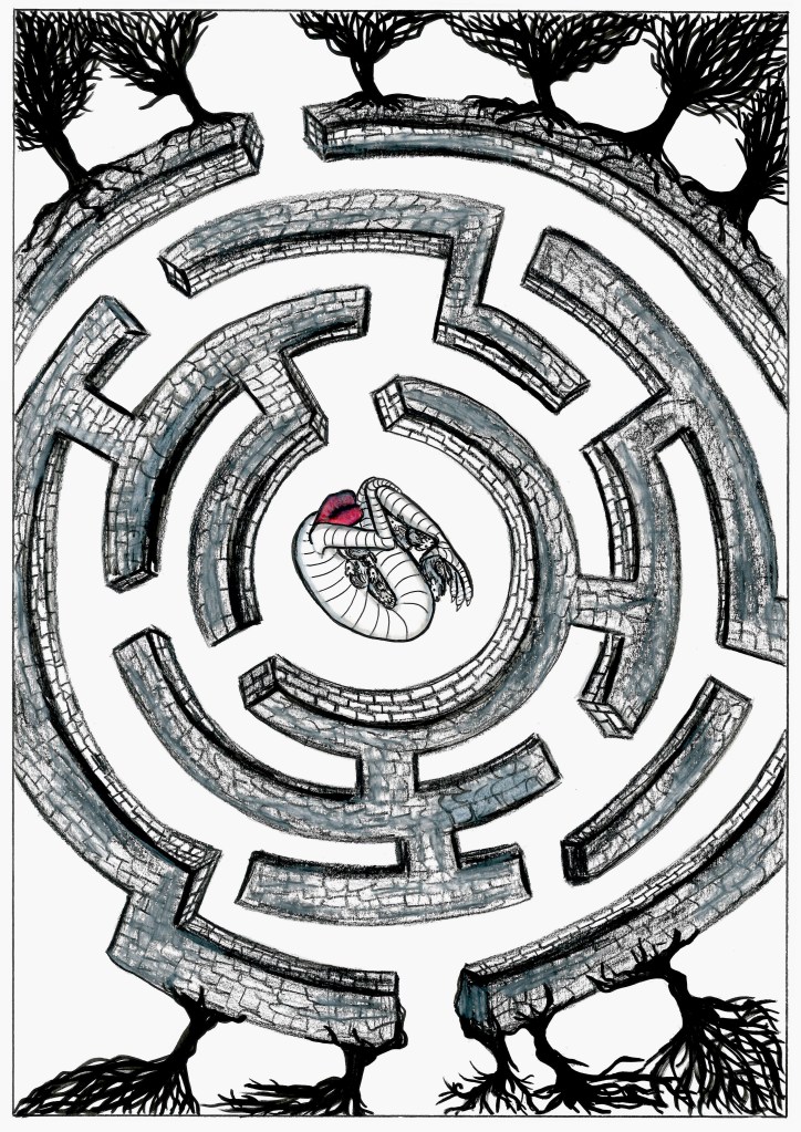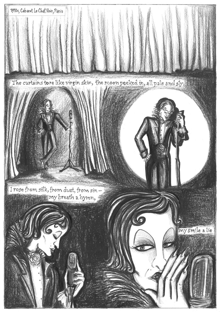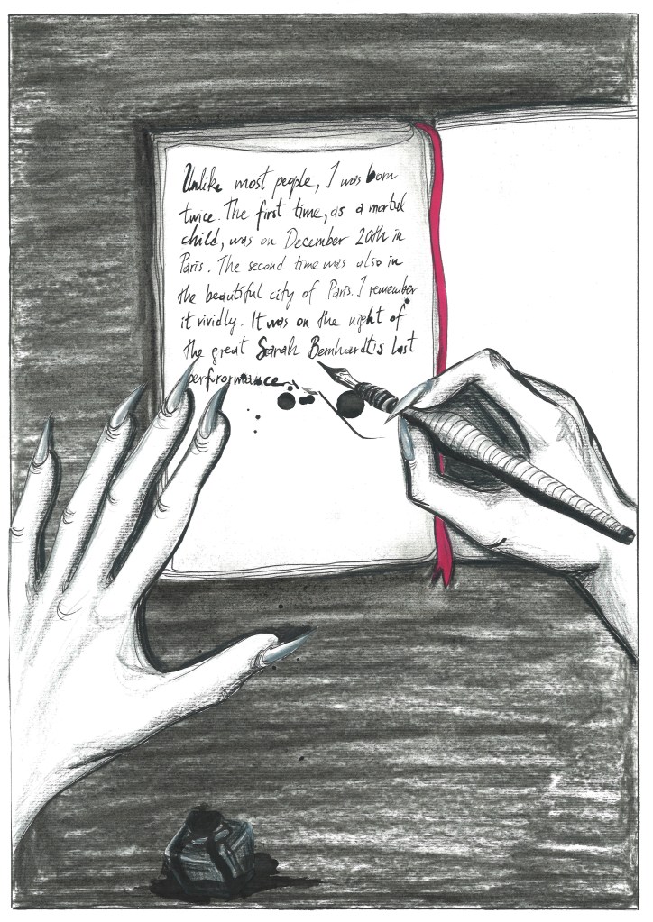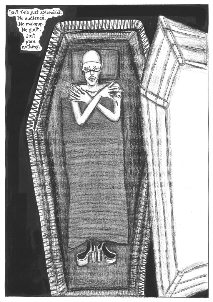 Vita sanguinis is a flip comic containing two intertwining tales of transformation: Menstrella, a fallen star whose surreal journey across seas, caves, forests, and dream-visions leads her to a revelation of the world’s true nature; and Fampir, the story of a weary young vampire drifting through centuries and selves, longing to escape the burden of eternal survival. Each narrative unfolds from opposite ends of the book until the characters finally meet—an unexpected encounter that could shift the course of both their destinies, should the story continue.